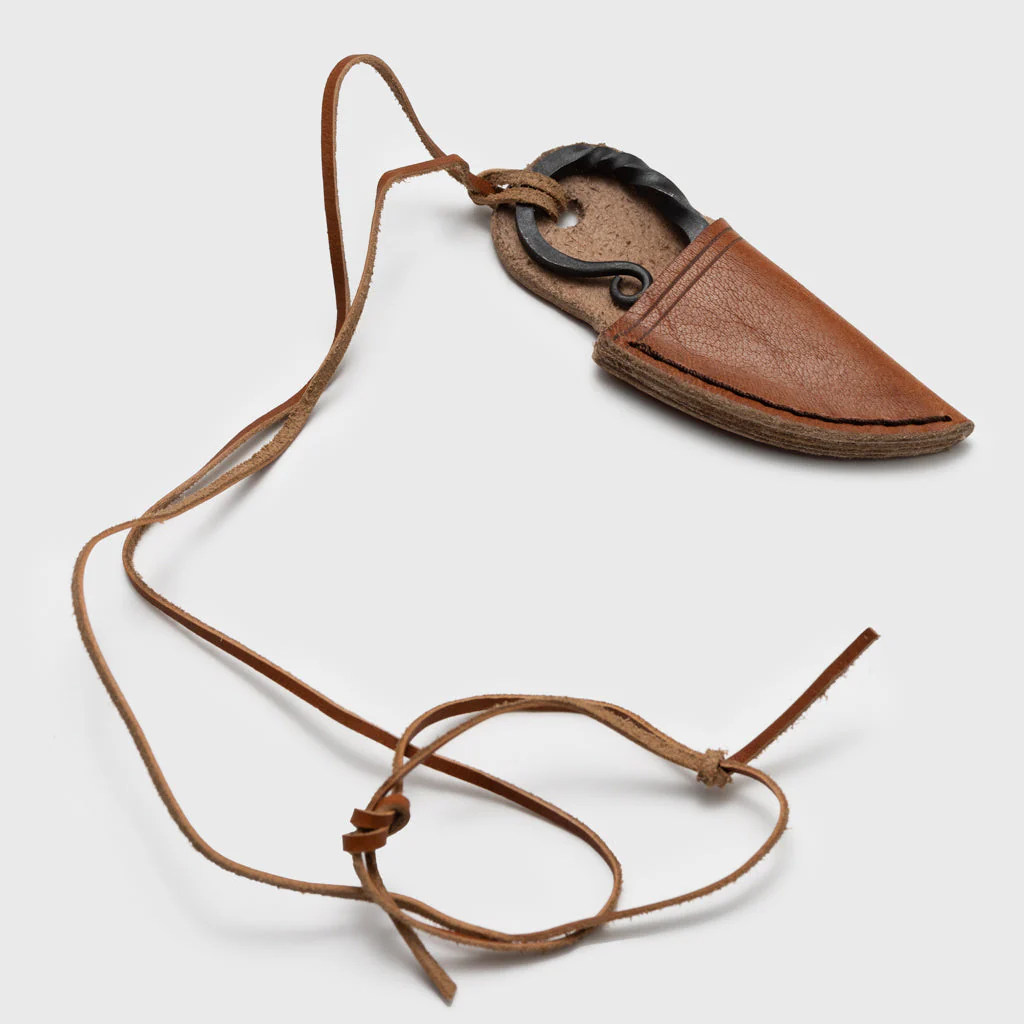 General purpose knife that can be worn around the neck. It has a hand-forged, sharpened carbon steel blade. The leather sheath is hand-stitched.