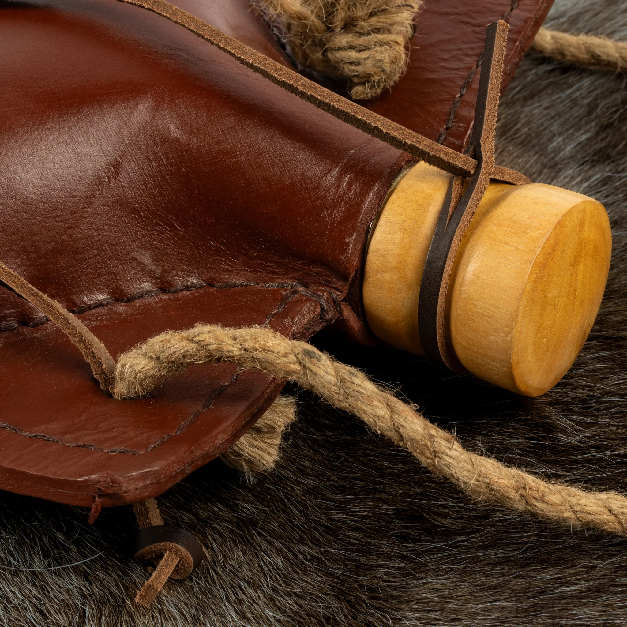 Stay hydrated on the battlefield with this historical leather water bottle. Leather bottles were used throughout the Viking Age to carry beverages during journeys. It is made from thick leather, hot-water molded, hand-stitched, and sealed with beeswax. To ensure the bottle is completely watertight, it has a stainless steel inner lining. It comes with a wooden stopper and a cord that allows it to be carried on a belt or over the shoulder.