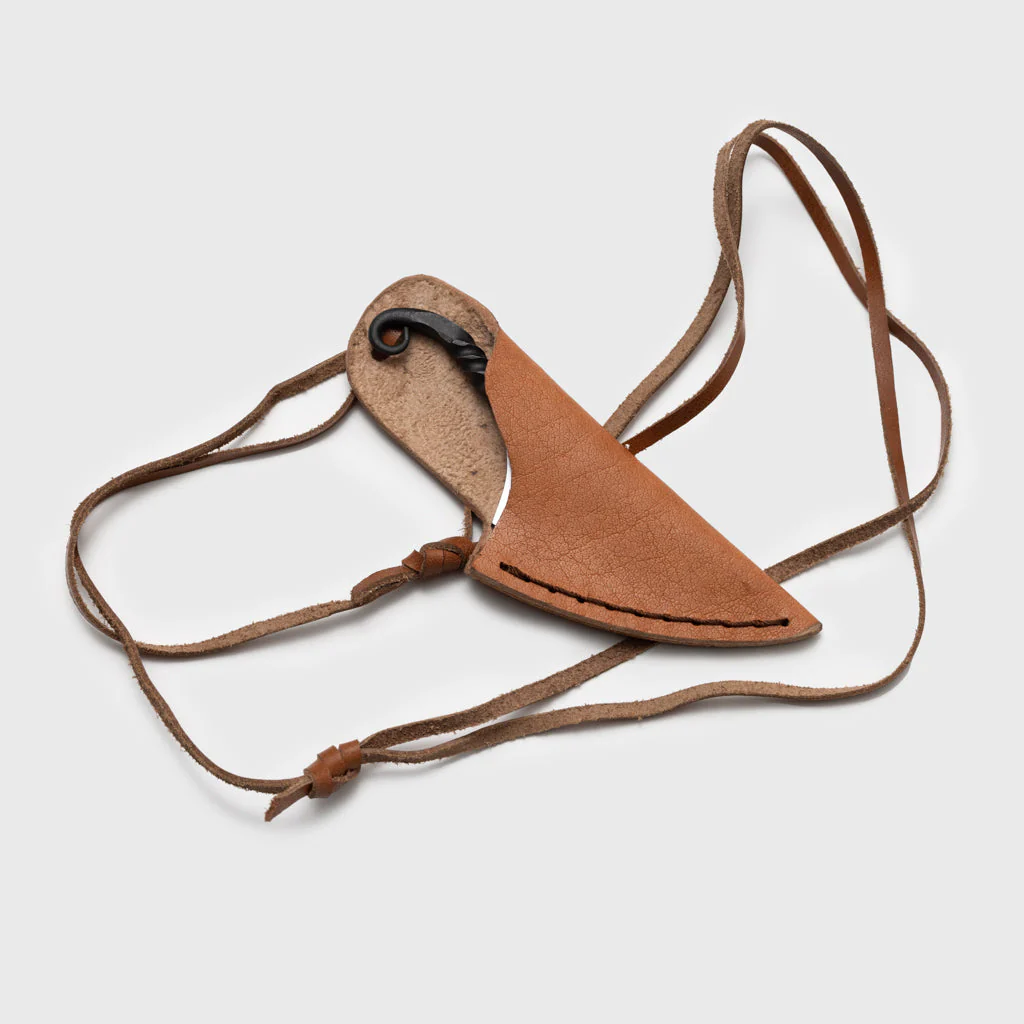 General purpose knife that can be worn around the neck. It has a hand-forged, sharpened carbon steel blade. The leather sheath is hand-stitched.