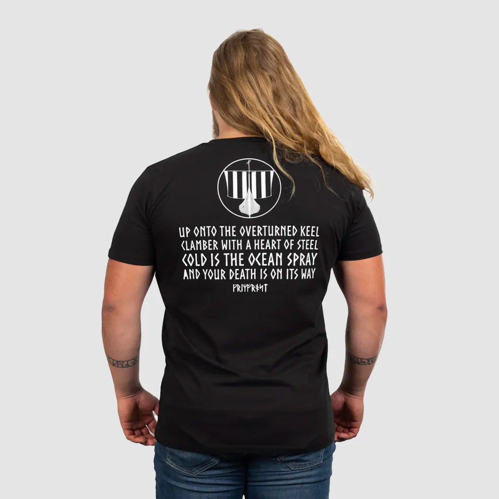 The part of the poem on the back of the shirt reads: Up onto the overturned keel, clamber with a heart of steel, cold is the ocean spray, and your death is on its way.