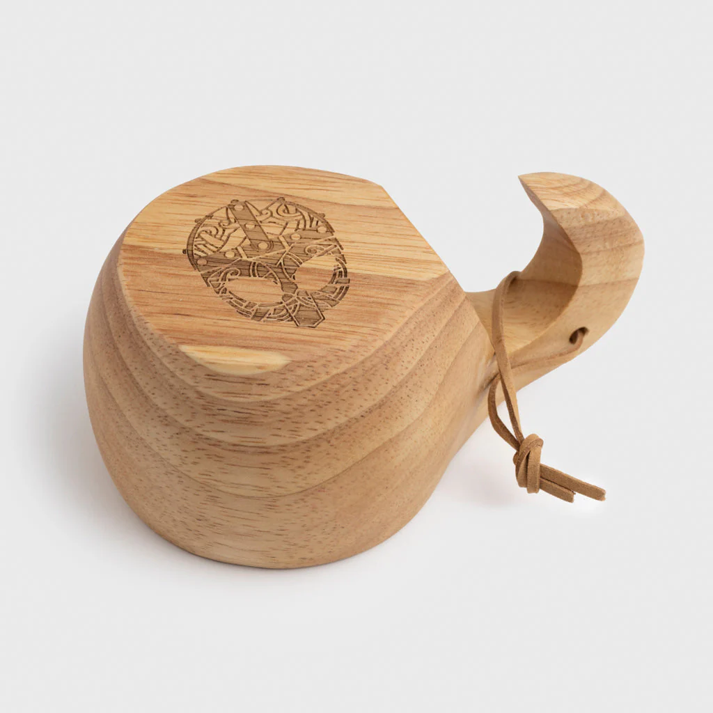 Wooden Kåsa (cup), which is a traditional Scandinavian drinking vessel. It is still the most common cup used by Scandinavian bushcrafters, hikers and campers. It comes with Grimfrost's runic logo on the side, and the Helmet logo under.